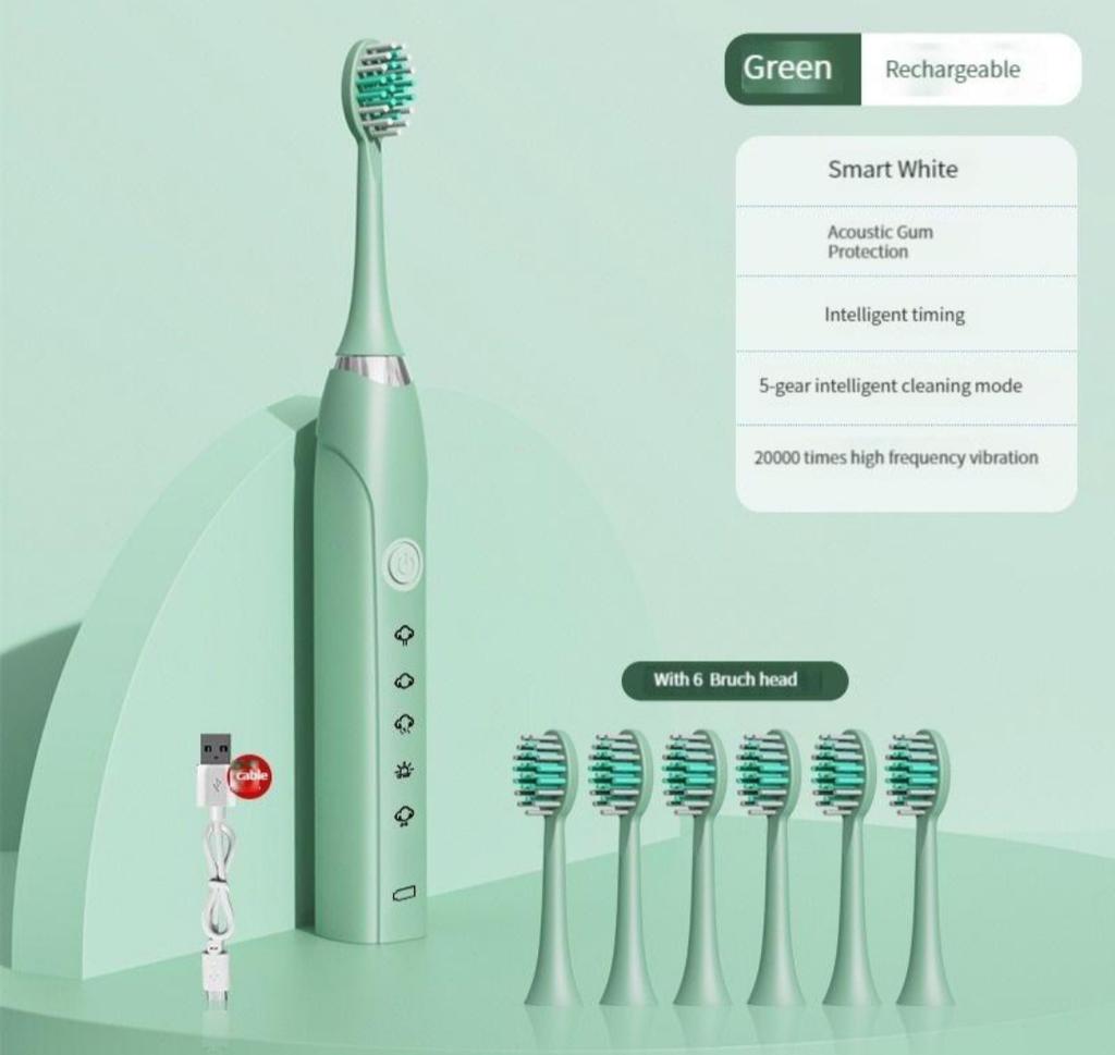 Elektrische Schallzahnbürste mit 5 Ersatz-Zahnbürstenköpfen, 5-Gang-Vibration, wasserdichte, aufhellende Zahnbürsten für Erwachsene