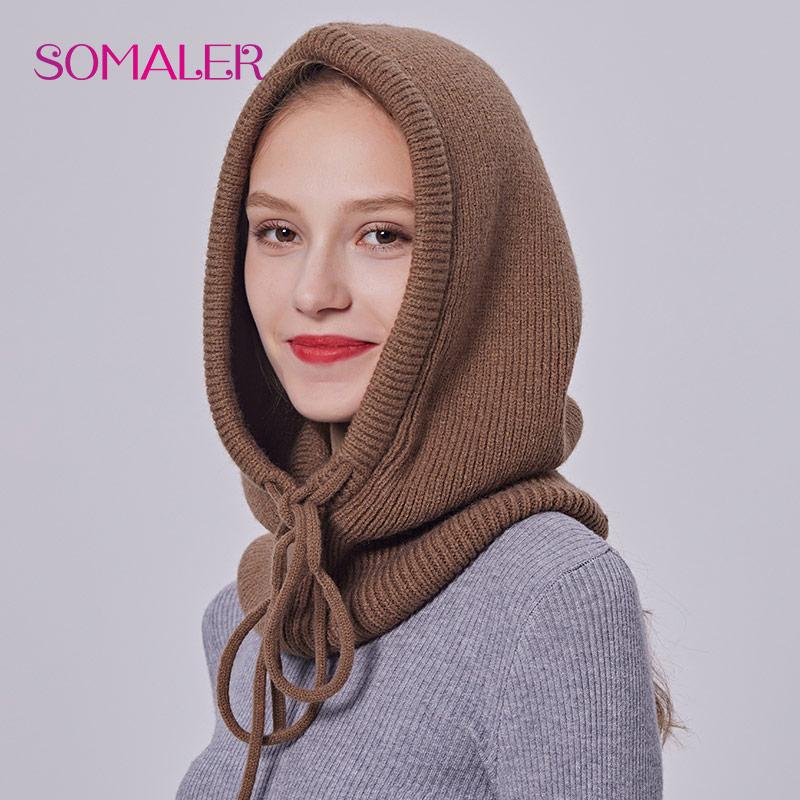 SOMALER Winterwolle, gestrickt, mit Kapuze, Acryl-Beanie-Mütze für Damen, Kopf-Ohr-Wärmer, einfarbig, verstellbare Schal-Mütze mit Seil