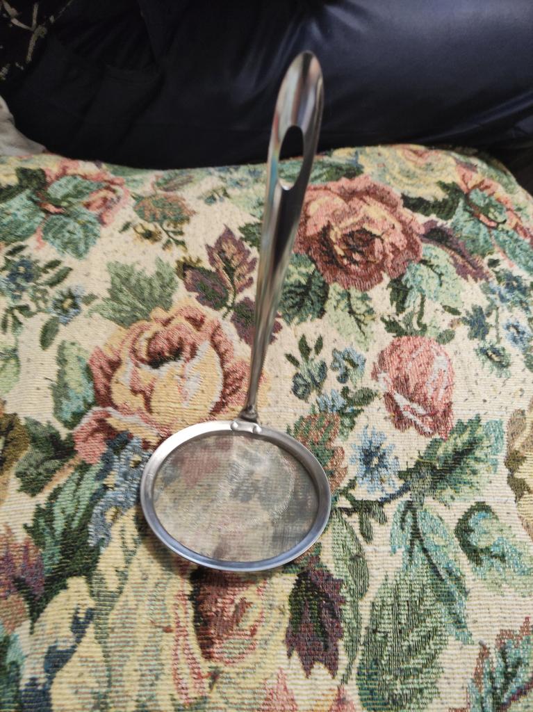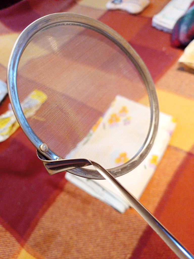 Edelstahlschaumkelle mit sehr feinem Netz, 20 cm Griff, 10 cm Durchmesser, bei starkem Kochen erscheint mir der Griff etwas kurz, scheuen Sie sich nicht, ggf. einen längeren Griff zu nehmen. Besonders gefährlich ist kochendes Öl!!! ...Ich habe zur Veranschaulichung einen kleinen Löffel daneben gelegt.