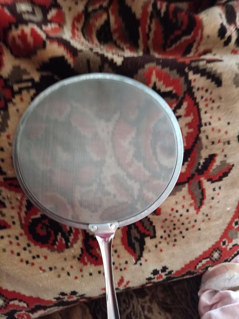 Norm, Maschenweite, mit einem Durchmesser fast wie eine Standard-Untertasse. Aus dünnem Metall.