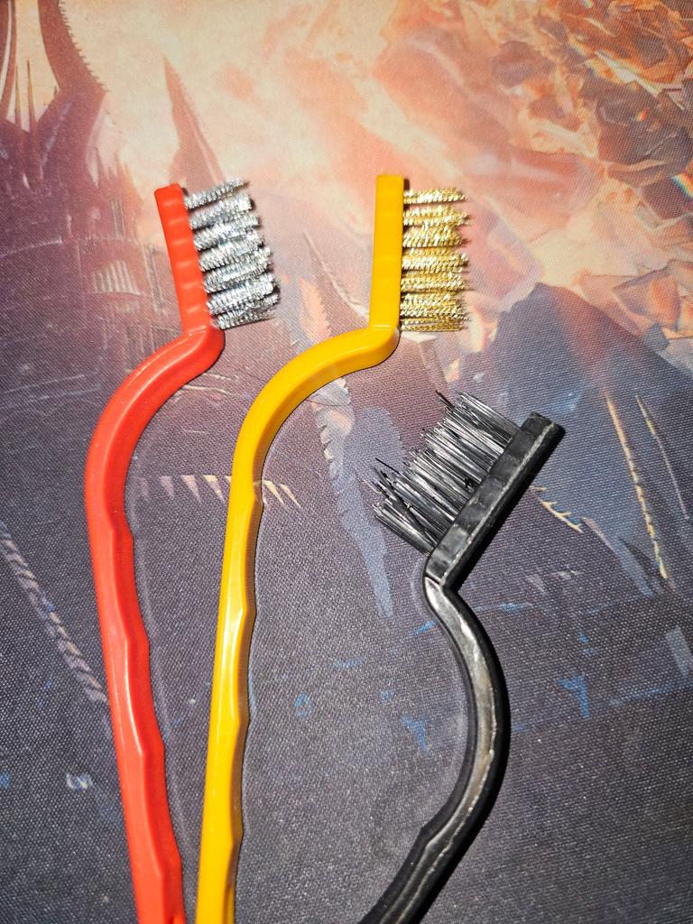 2 Bürsten haben Metallborsten, eine hat Kunststoffborsten. Alles ist gereinigt