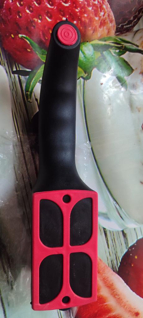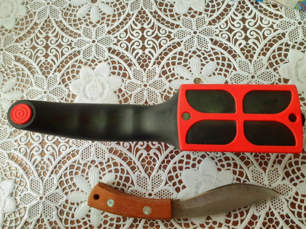 Das Messer ist gut, ich habe es in Aktion ausprobiert. Praktisch ist, dass es einen Griff zum Halten gibt; es verrutscht auch nicht auf dem Tisch, denn Es gibt Gummistopfen. Drei verschiedene Einteilungen unterschiedlicher Tiefe für unterschiedliche Messer – breiter und schmaler. Ich empfehle zum Kauf.