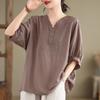 Sommer Slim Stehkragen Baumwolle Leinen Top für Frauen Bluse Floral Kurzarm Flip Kragen Künstlerisches Hemd