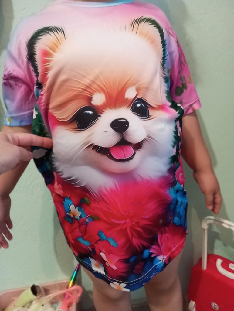 Das T-Shirt ist hell und fällt nicht klein aus. Auf dem Foto ist das Kind 110 cm groß, aber eher groß, das T-Shirt sitzt etwas locker, wie eine Tunika, also nicht für diese Saison