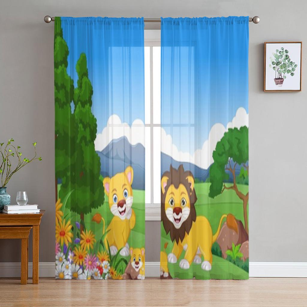 Lustiger Löwe-Cartoon im Dschungel, Tüllvorhänge für Wohnzimmer, Küche, Fenster, Vorhänge, Heimdekoration, transparenter Vorhang für Kinderschlafzimmer