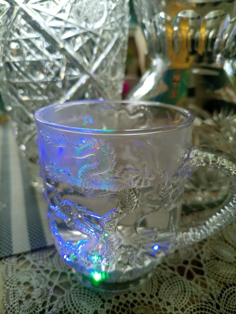Tolle Tasse, leuchtet bei Wasser. Trinkt man das Wasser aus, erlischt sie. Die Tasse ist aus Kunststoff, die Ränder sind nicht sehr glatt.