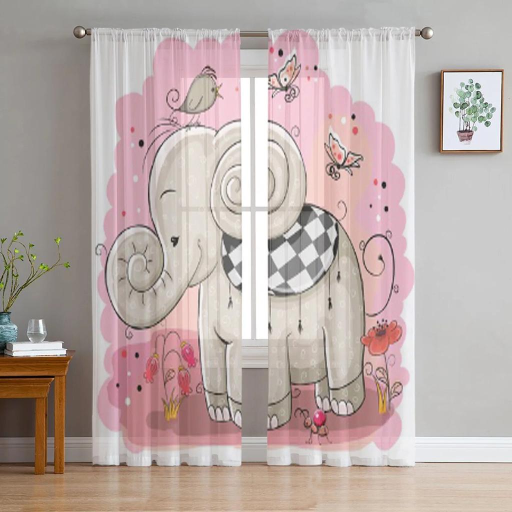 Niedlicher Cartoon-Elefant und ein Vogel, durchsichtige Vorhänge für Wohnzimmer, Kinder, Schlafzimmer, Tüllvorhänge, Küche, Fenster, Behandlungsvorhänge