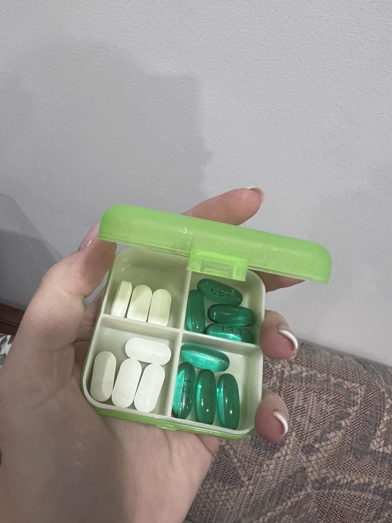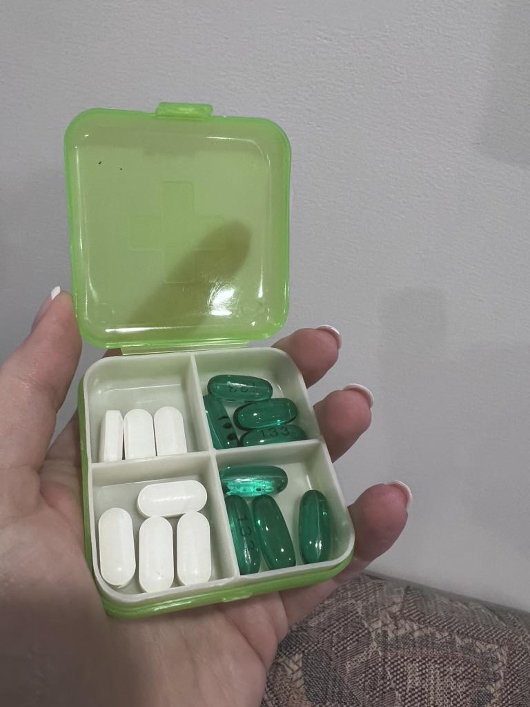 Eine gute Pillendose, aber nicht für unterwegs; Wenn Sie die Schachtel auf dem Tisch aufbewahren, bewegen sich die Pillen in der Schachtel, wenn Sie sie umdrehen.