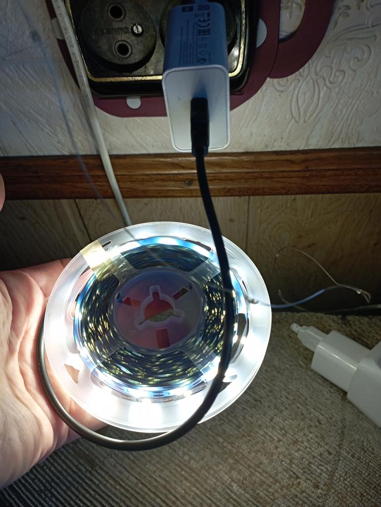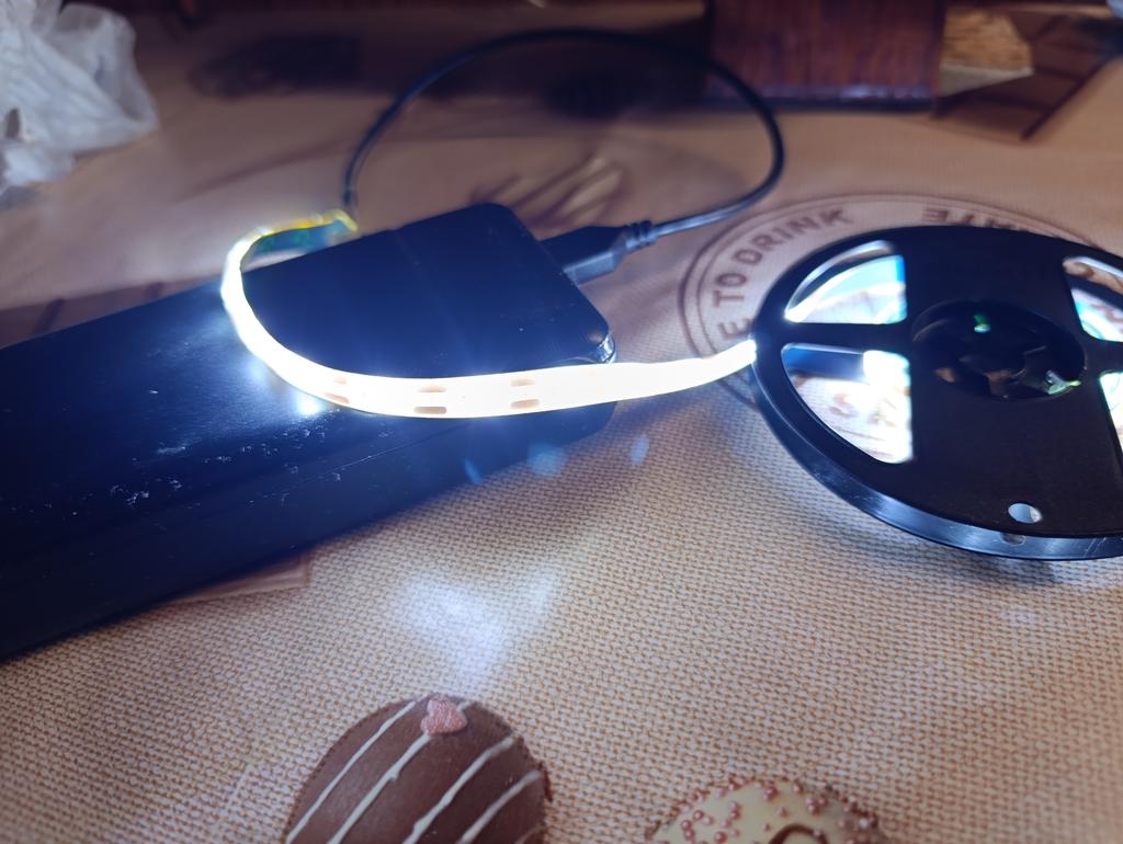Es brennt hell, ein 2-Meter-Streifen verbraucht 1,2A, der zweite 1,0A. Es ist notwendig, die Helligkeit zu reduzieren, da sonst die Powerbank schnell entladen wird. Die Helligkeit wird entsprechend der Größe der Powerbanks reduziert. Es wird ein Gleichgewicht zwischen Helligkeit und Leistung erreicht.