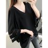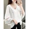 Elegante V-Ausschnitt-Bluse aus Chiffon mit ausgestellten Ärmeln und Gaze, Damenbekleidung, übergroße, lässige Pullover, süßes Hemd