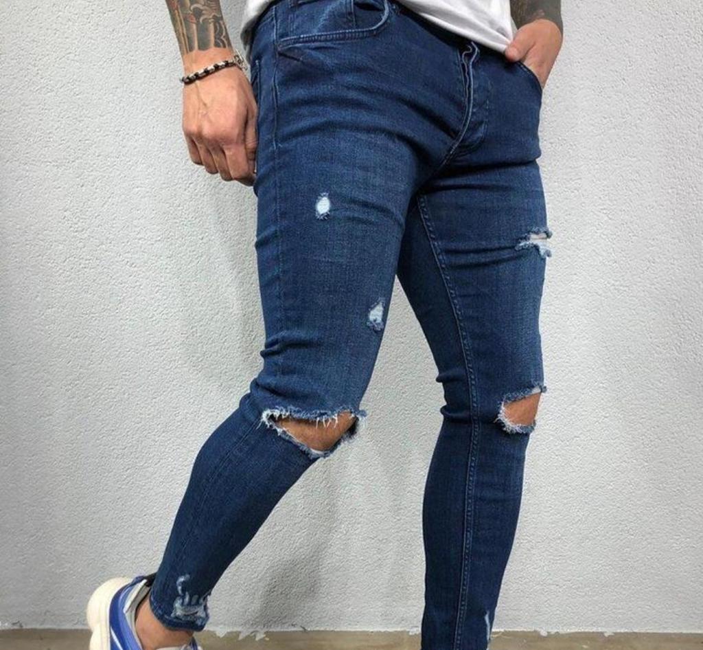 Distressed Knielöcher Elastische Röhrenjeans Herren Zerrissene Biker-Jeans Einfarbig Verwaschen Streetwear Schwarz Pantalones Hombre Joggers