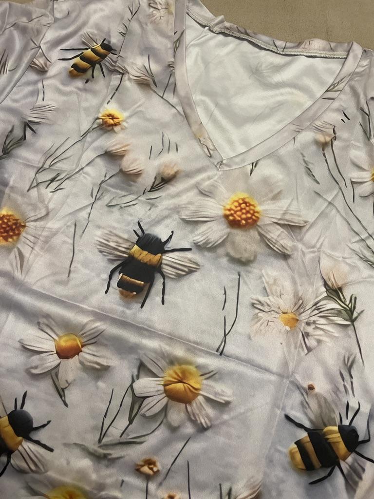 T-Shirt mit V-Ausschnitt und Blumendruck, lässiges Kurzarmoberteil für Frühling und Sommer, Damenbekleidung