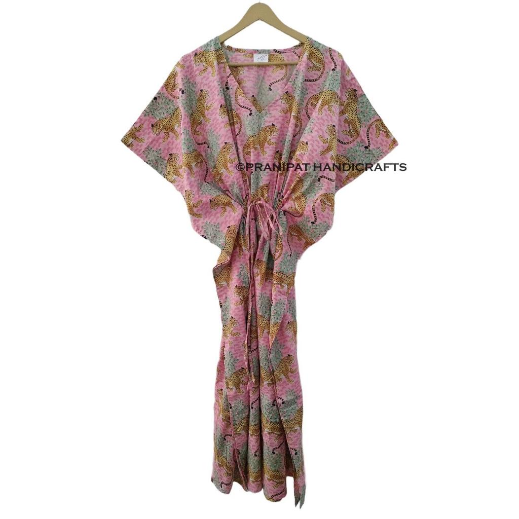 Damen Babyrosa Bagheera Tiger Bedrucktes Baumwoll Maxi Strand Überwurf Kaftan Kleid CKFTN-SCRN-FULL-BUYIT-149