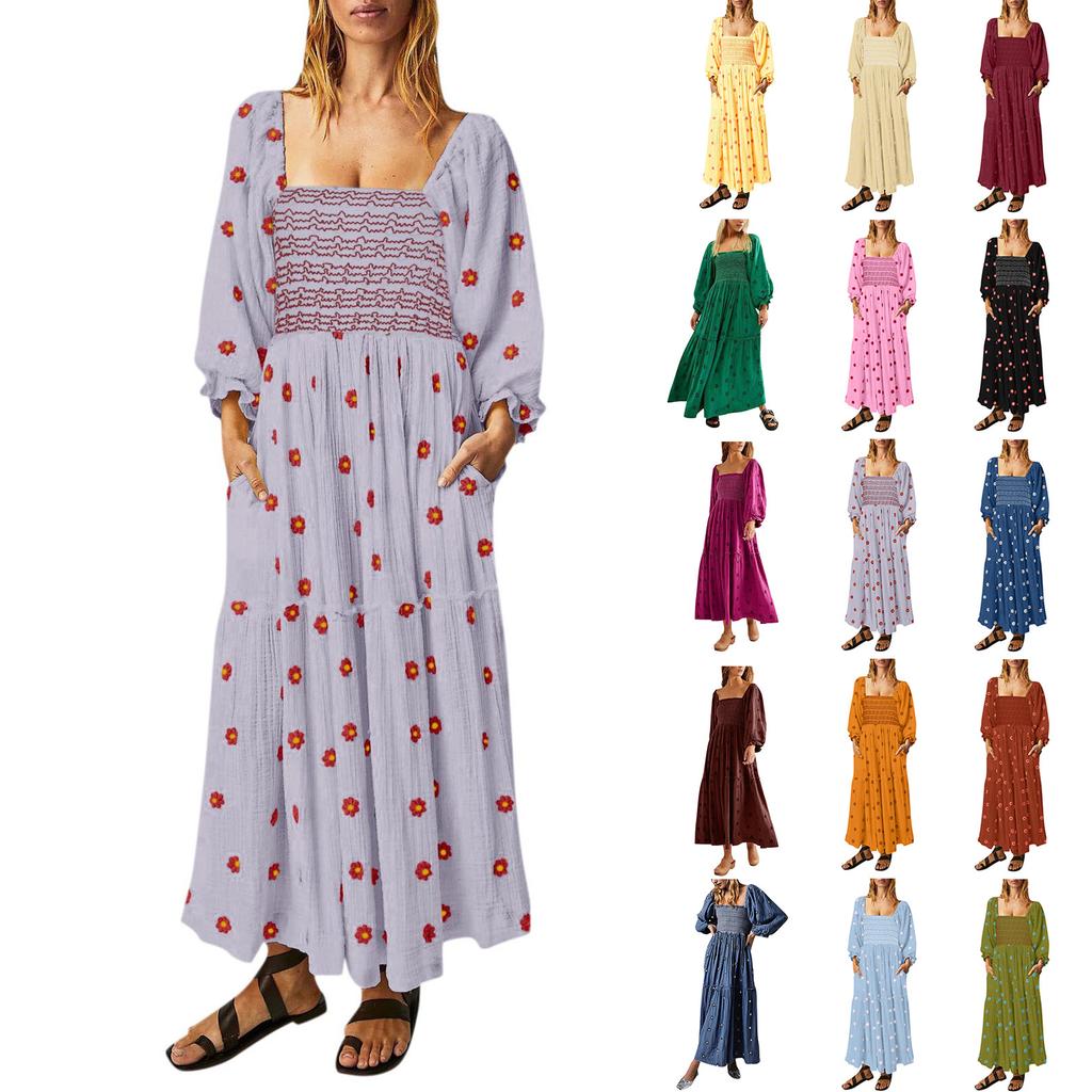 Herbst Damen Casual Kleid Quadrat Kragen Horn Ärmel Langen Rock Casual Und Sommer Maxi Kleider Für Frauen