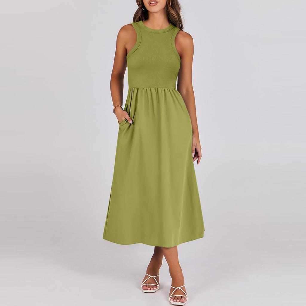Damen Casual Mode Einfarbig Rundhals Sexy Ärmelloses Tanktop Midilanges Kleid