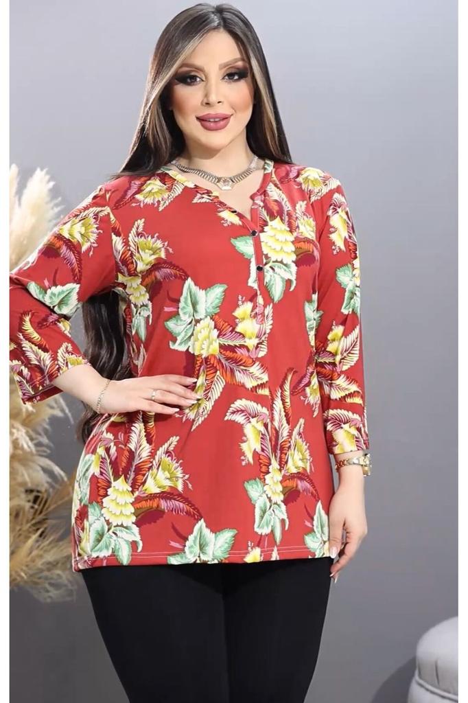 Damen Übergröße Kaminrot Gemusterte Kragenbluse