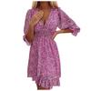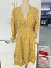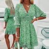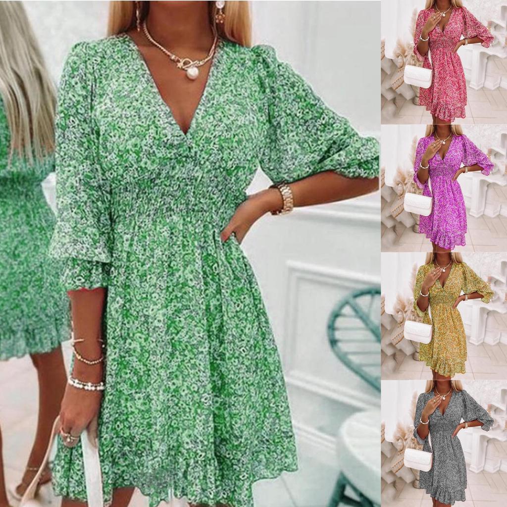 Damen-Kleid, lässig, modisch, kurzärmelig, V-Ausschnitt, Chiffon, Blumenmuster, Kunststoff-Taille