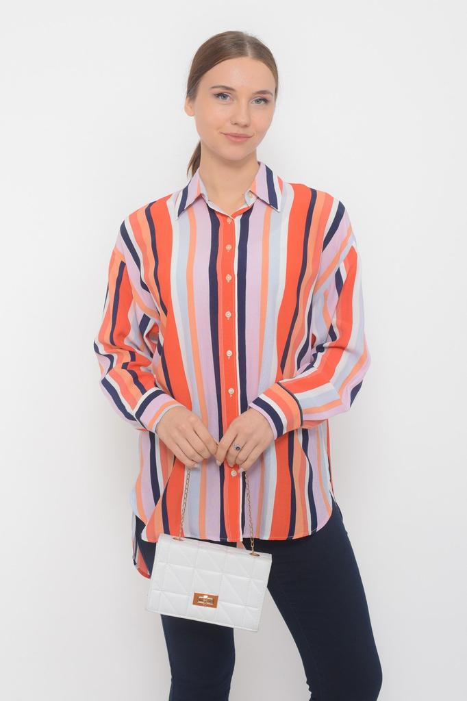 Buntes Krepphemd in großer Größe., Produkt ist Kreppstoff. Der Stoff enthält Seide, Viskose und Baumwolle. Das Produkt ist leicht und bequem. Es verursacht kein Schwitzen. Es sorgt für ein lockeres und lockeres Erscheinungsbild. Es knittert nicht so leicht. Es sorgt für ein auffälliges und stilvolles Erscheinungsbild. Der Stoff des Produkts ist fließend und klebt nicht an den Körperlinien. ., Auf links waschen, im Schonwaschgang., Das Produkt auf dem Model ist Größe 40., Maße des Models: Höhe: 1.76 Truhen: 92, Taille: 67, Hüfte: 96.