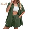 Werten Sie Ihre Freizeitgarderobe mit diesem vielseitigen Damenanzug auf. Das Set besteht aus einem kurzärmeligen Button-Down-Hemd und Shorts mit elastischem Kordelzug in der Taille und bietet eine entspannte Passform für täglichen Komfort..