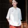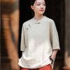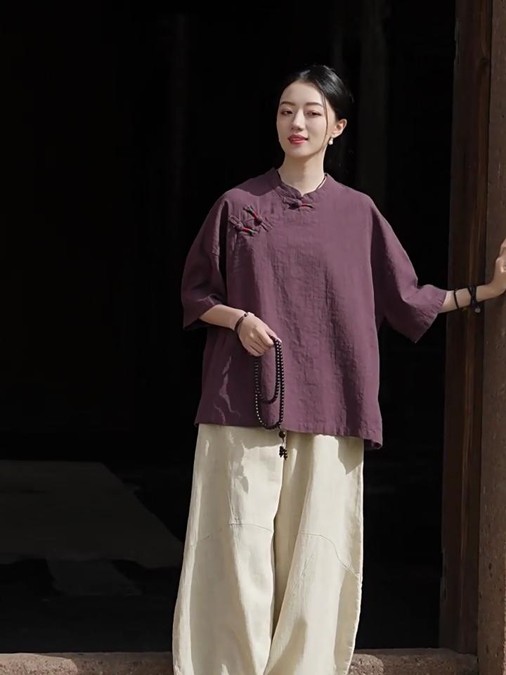 Johnature Damen Chinesischer Stil Hemden Oberteile Stehkragen Lila Halbe Ärmel Blusen Sommer Knopf Vintage Hemden