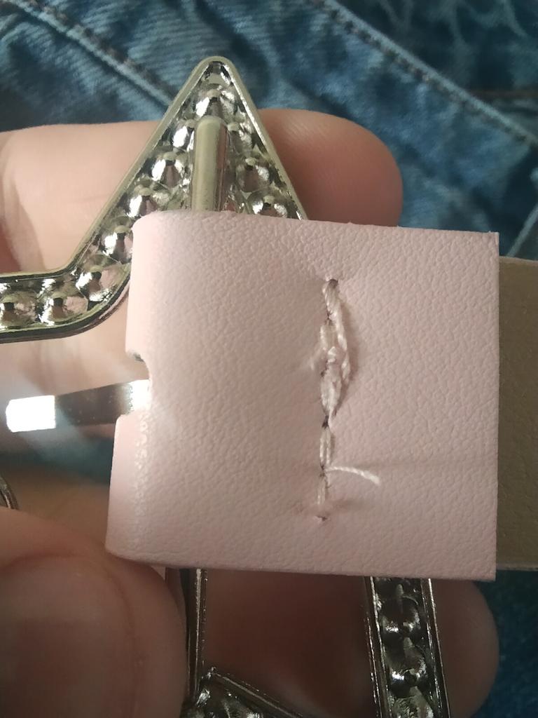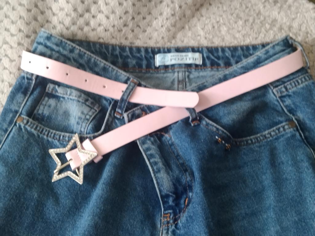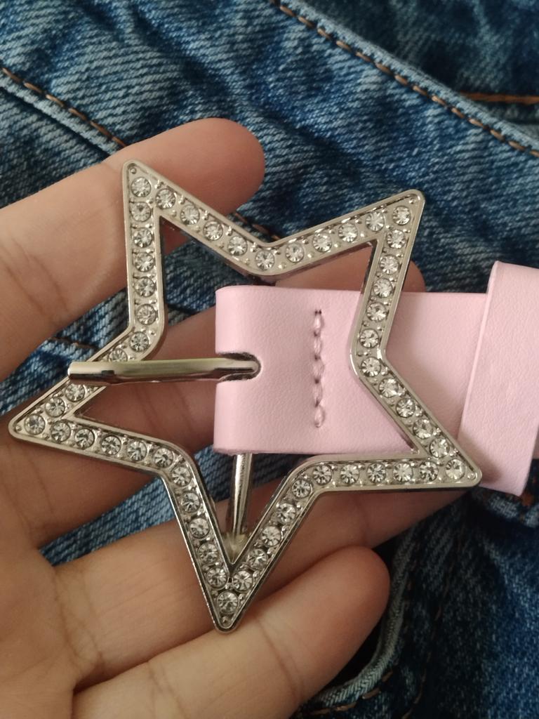 Der Gürtel ist weniger leuchtend als ich erwartet hatte. Er ist hellrosa, mit Strasssteinchen auf dem Stern. Es gibt 12 Löcher, dank denen Sie die Größe bequem anpassen können.. + schönes Armband - wenn ich sitze, drücken die Ecken des Sternchens auf den Bauch, wenn man lange so sitzt oder sich beugt, hinterlassen sie Abdrücke auf der Haut