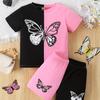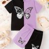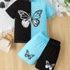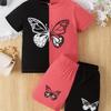 Color Clash 2-teiliges Set aus T-Shirt und Shorts für Mädchen, kurzärmliges Oberteil mit Cartoon-Schmetterlings-Print, lässige Outfits, Kinderkleidung für den Sommer