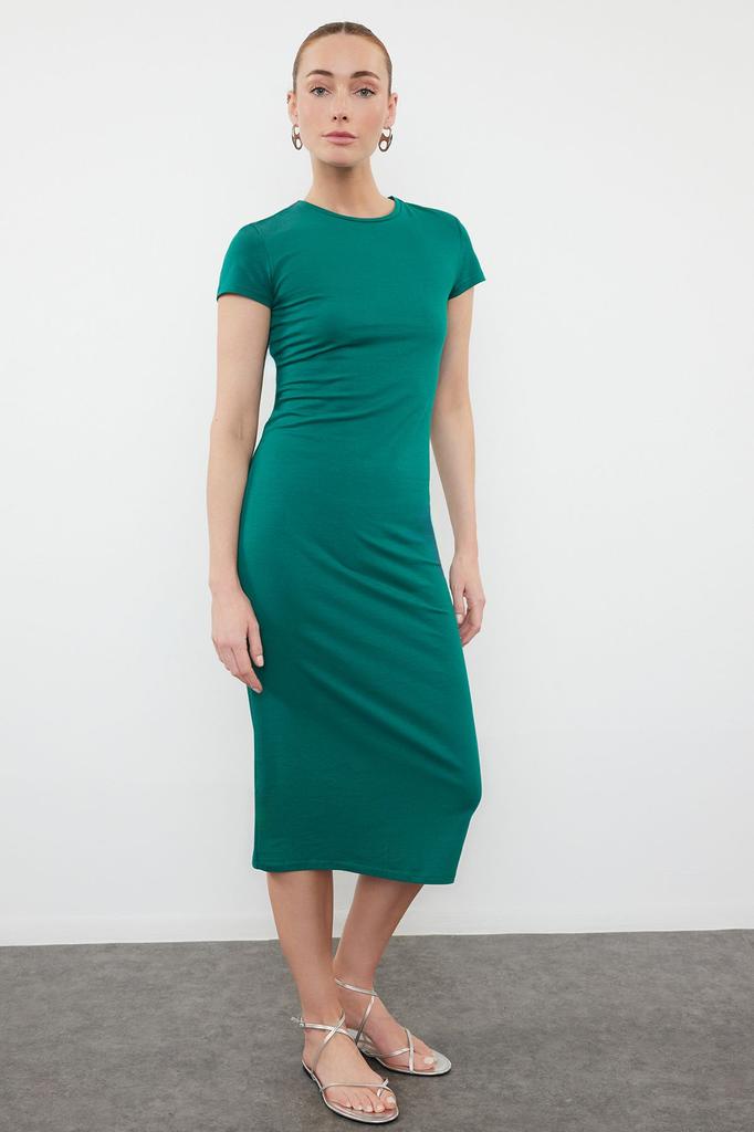 Women's Style Dress Emerald Green Short Sleeve Fitted Cotton Stretchy Midi Knitted Dress