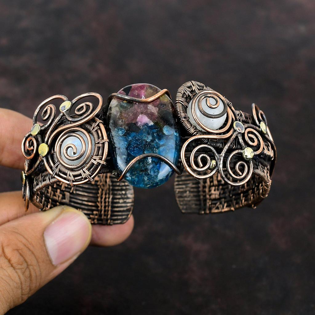 Watermelon Tourmaline Bangle Copper Wire Wrapped Gemstone Cuff Bracelet Adjustable Bangle Handmade Moonstone Bangle Copper Jewelry For Gift