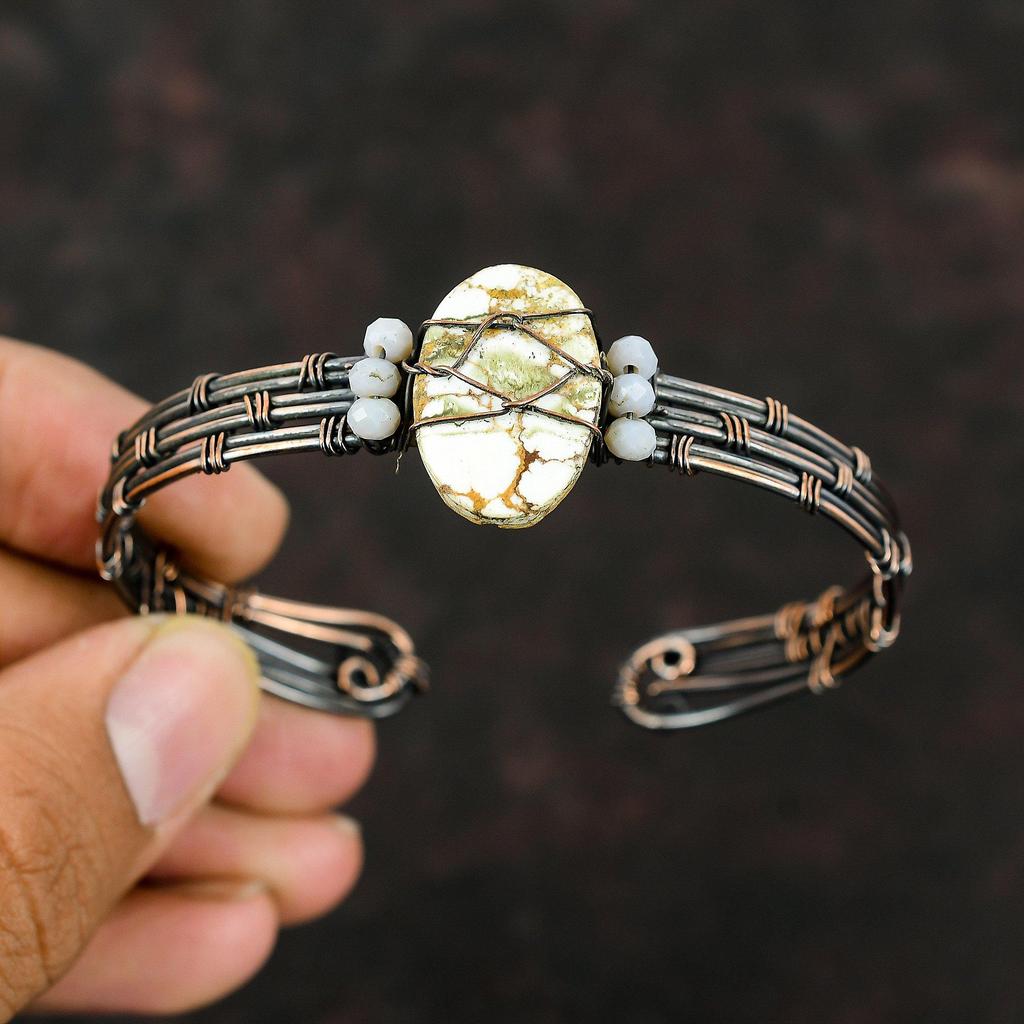 Wildpferd Magnesit Manschette Blaue Spitzenachat Perlen Armband Kupferdraht umwickelter Schmuck Verstellbarer Armreif Handgefertigte Manschette Edelstein Kupferarmreif