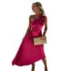 Die schrägen Schultern, die dreidimensionale Blumendekoration und das Taillendesign verleihen einen Hauch von Eleganz. Die hohle Taille, das plissierte Meerjungfrauenkleid und die A-Linien-Silhouette betonen Ihre Figur.