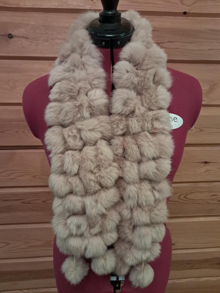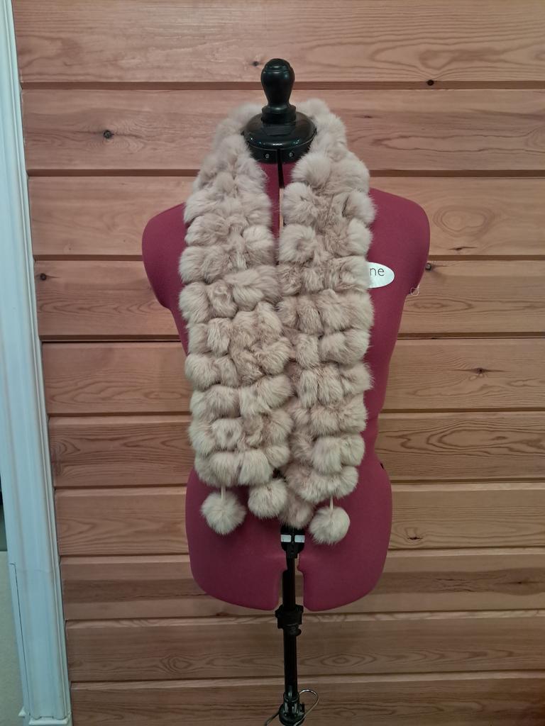 Schal aus echtem Kaninchenfell. Hübsch, weich, warm. Hergestellt aus Pompons, die mit einer Schnur verbunden sind. Breite 13 cm, Länge 108 cm.