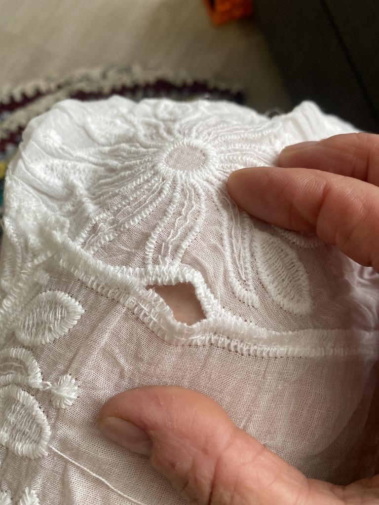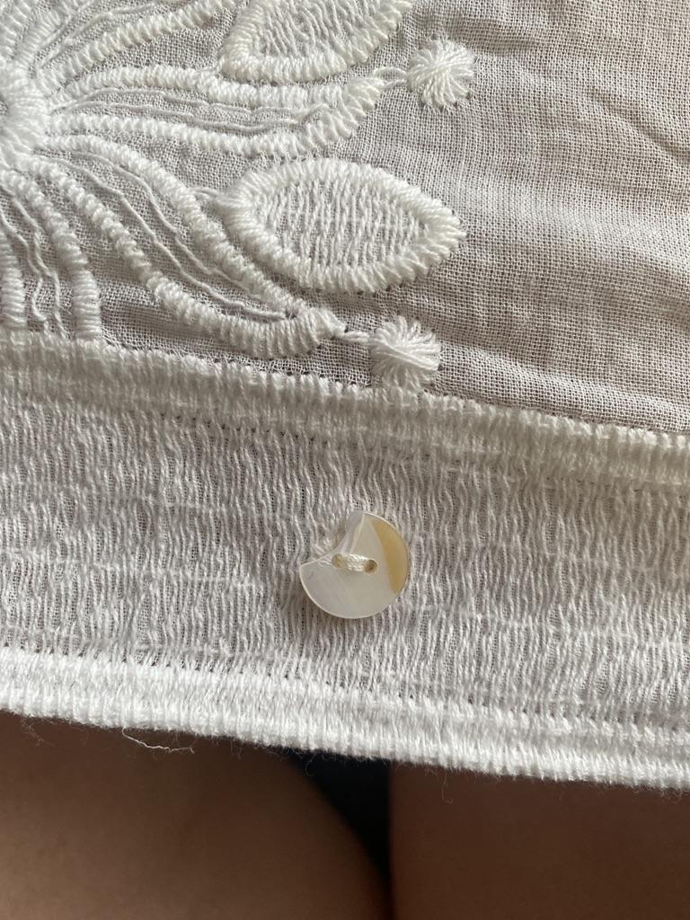 Die Bluse ist nicht schlecht, aber das Loch von zwei cm und die kaputten Knöpfe werfen viele Fragen auf. Ist das Ding wirklich 1500 Tausend wert?