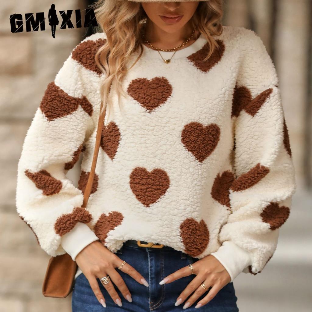 GMXIA Fließender Damen Herbst Winter Plüsch Liebe Print Locker Langärmliger O-Ausschnitt Pullover Hoodie