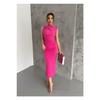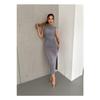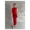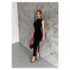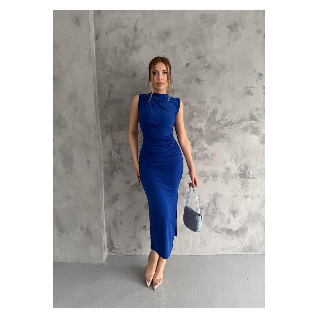 Elegance Navy Blue Dress With Draped Shoulder And Waist Parts, Zero Sleeves And Slit Detail