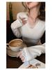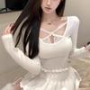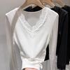 Frankreich Sexy Spitze Weiß Langarm T-Shirt Damen Elegant V-Ausschnitt Slim Unterhemd Herbst Winter Mode Patchwork Lässige Oberteile