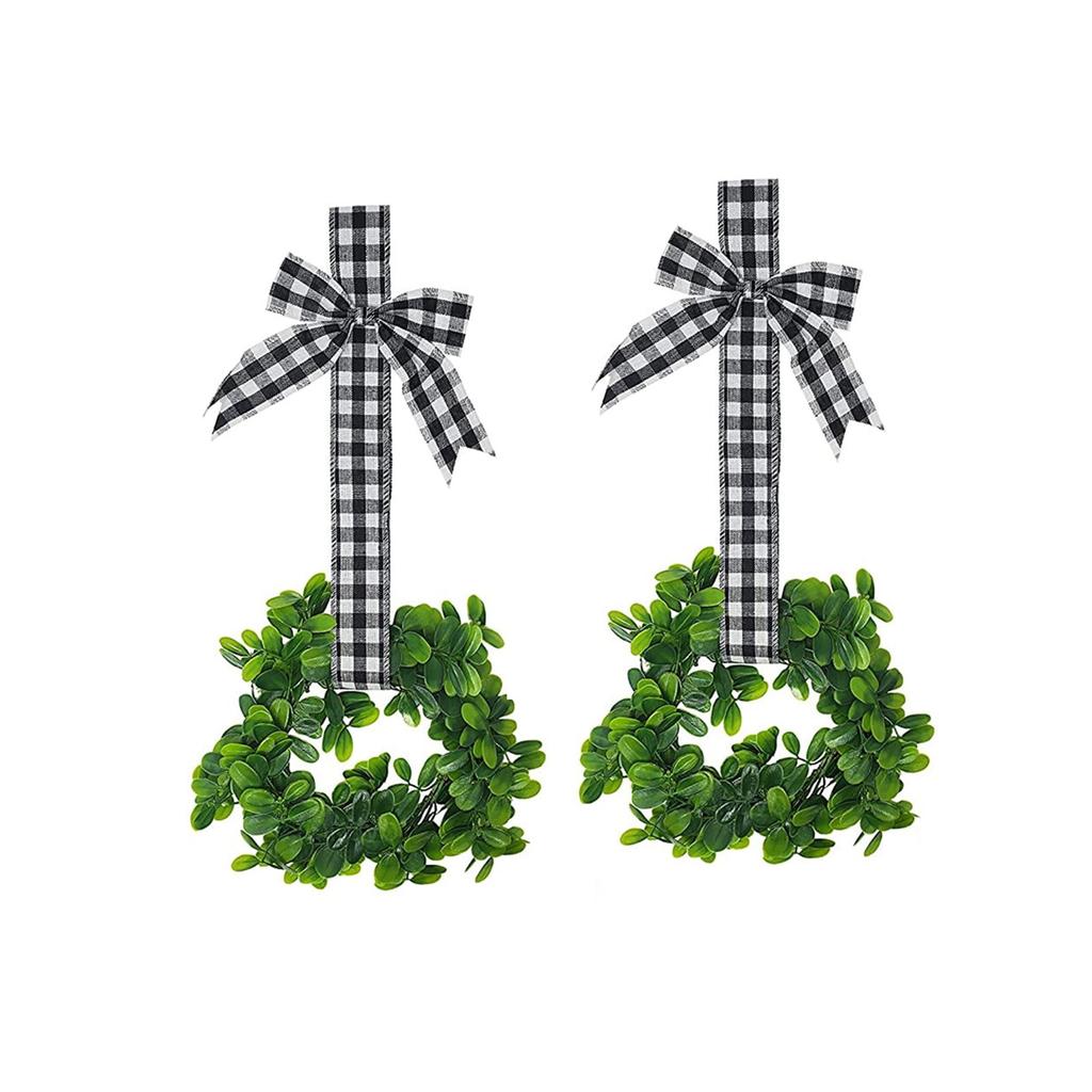 Set Of 2 Hanging Wreaths With Plaid Ribbon Bow. Christmas Decoration For Kitchen Cabinets, Behind Chairs, Doors, Railings & - Black & Red Plaid Bow
