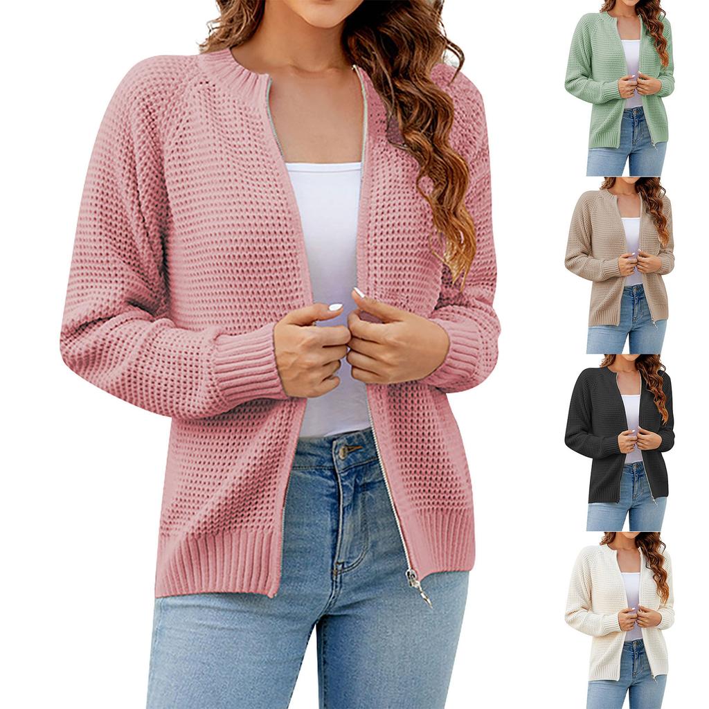 Merkmale: Strickpullover für Damen, lange Ärmel, Kragen, durchgehender Reißverschluss, gestrickt, glatter, praktischer Reißverschluss, einfarbig, süßer Vintage-Stil.