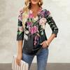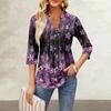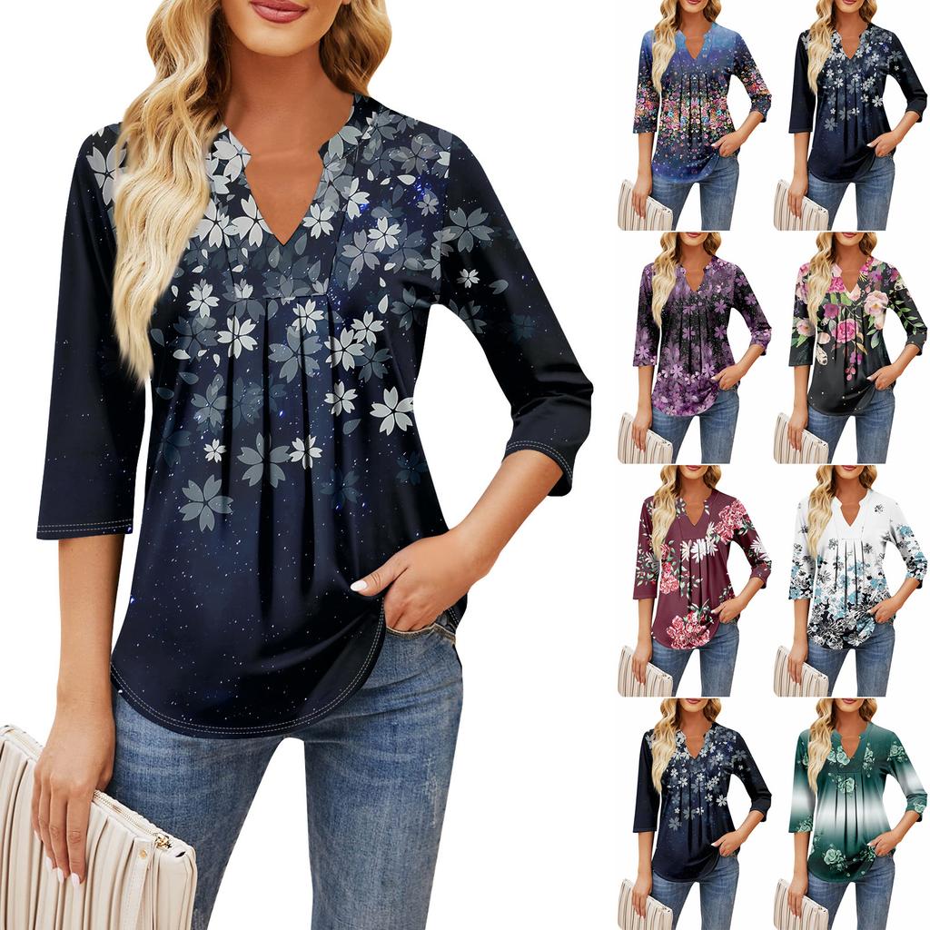 Damen-Oberteile mit Siebenviertel-Ärmeln, lässig, V-Ausschnitt, Rüschen auf der Brust, Druck, lockere T-Shirt-Oberteile