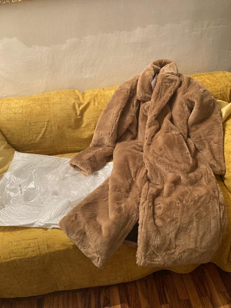 Der Brustumfang beträgt eindeutig 132 cm und der Saum des Pelzmantels ist schief genäht und zieht sich nach innen.