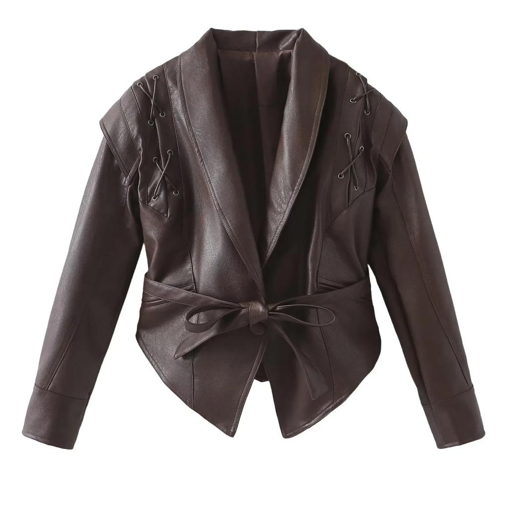 Mode Leder Frau Kurze Jacke Mit Gürtel Drehen Unten Kragen Langarm Motorrad Mantel Damen Winter Warme Street Oberbekleidung