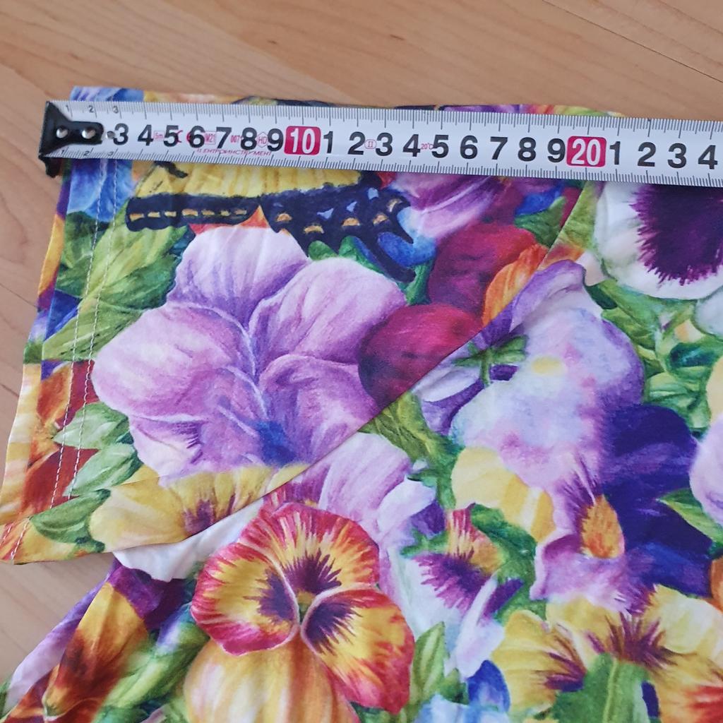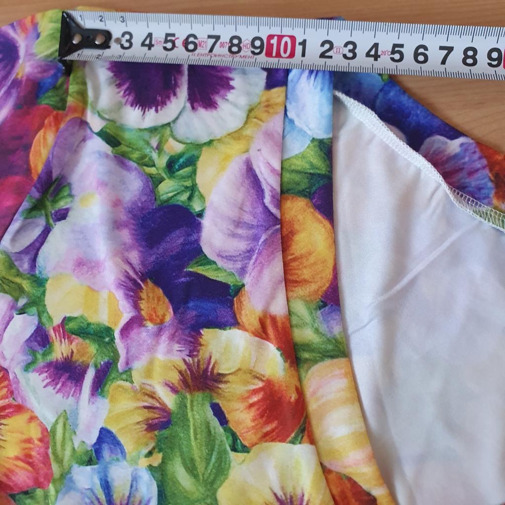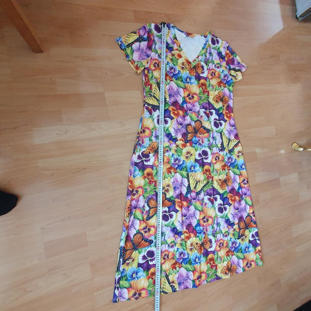 Hell, angenehm am Körper, leider Synthetik, aber gut genäht, lang im Sommer, tut mir leid, Sie können nur mit diesem Kleid spazieren gehen, helles Muster, so frühlingshaft, so saftig, ich empfehle es Mädchen, sehr hübsches Ding
