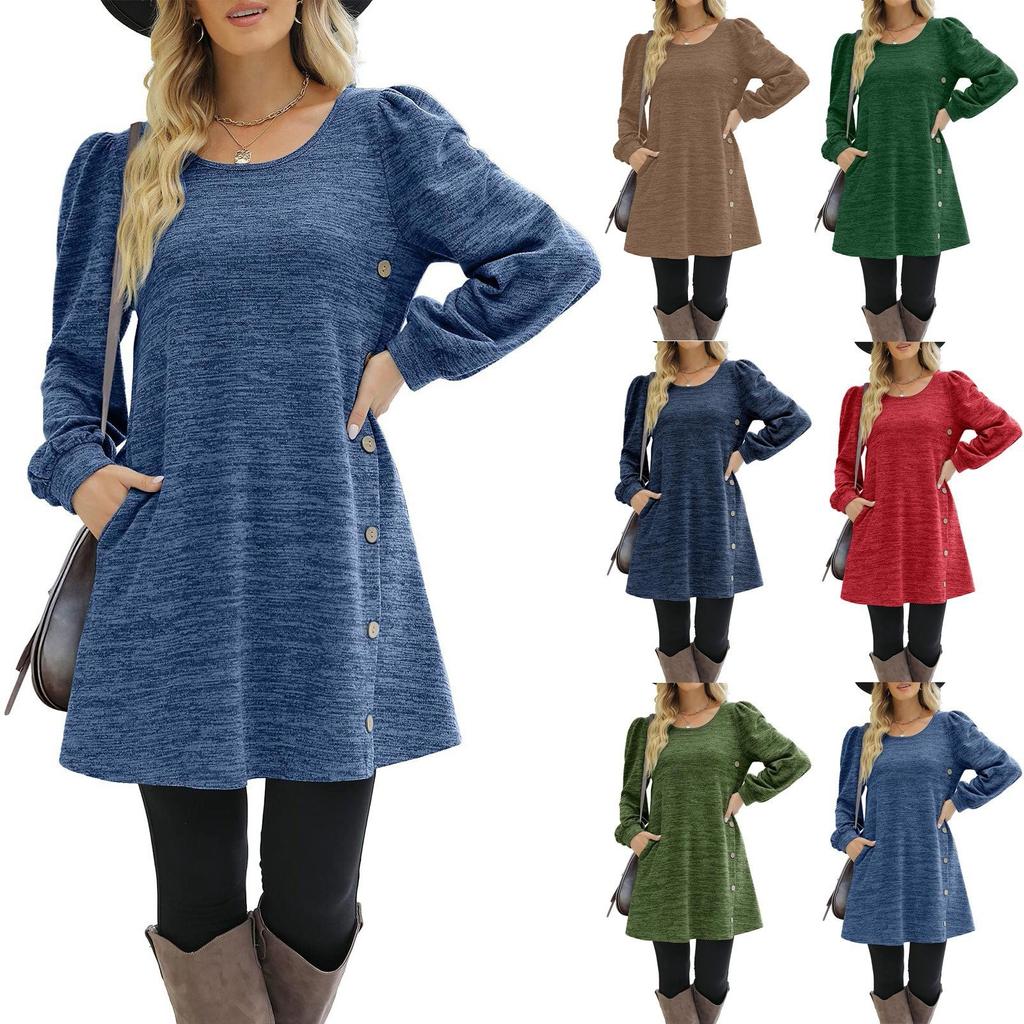 Mode Frauen Rundhals Einfarbig Taste Langarm Casual Lose Kleid