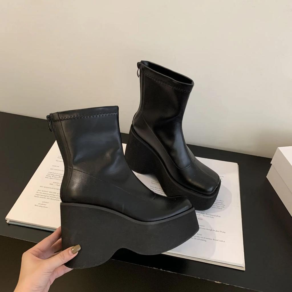 Echtes Leder Plateau Dicke High Heels Damen Stiefeletten Schwarz Quadratischer Kopf Hinten Reißverschluss Bequeme Gothic Schuhe Zapatos Mujer