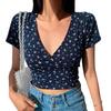 Retro-Blumen-T-Shirt mit überkreuztem V-Ausschnitt, schmaler Passform und kurzen Ärmeln für einen modischen und vielseitigen Look.
