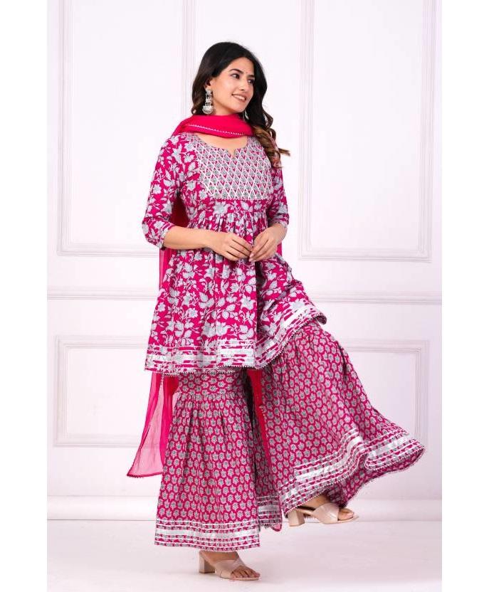 Damen Party Wear Baumwolle Viskose Kurta Sharara Dupatta Set Indisches Designer Top Tunika Kurti