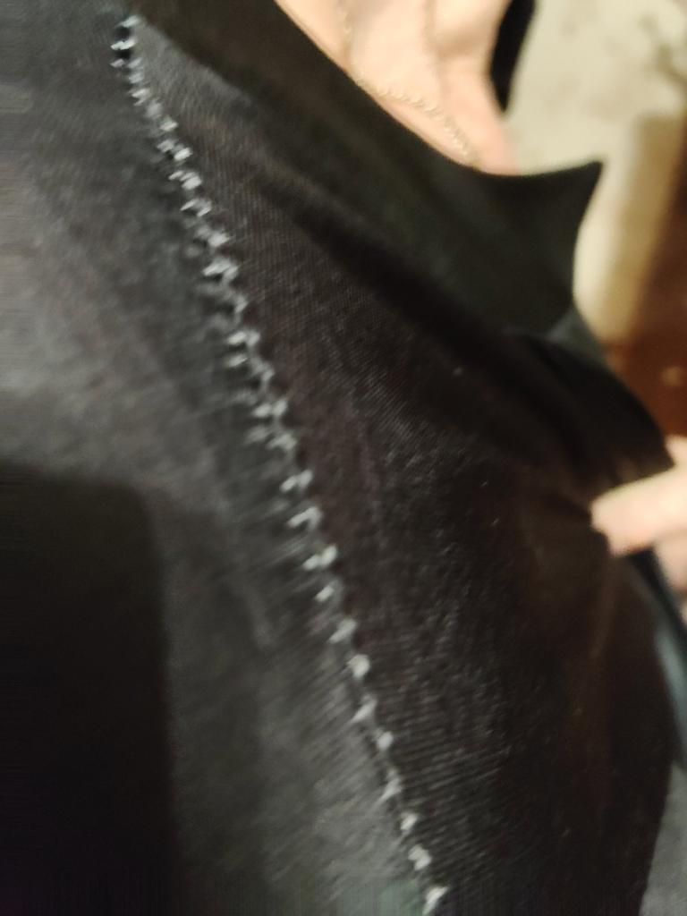 Schreckliche Qualität, der Saum ist sehr weit, steht wie ein Brett am Bauch ab, an den Schultern etwas zu eng. Die Nähte sind weiß auf Schwarz, scheinen durch. Die Ärmel sind sehr eng.