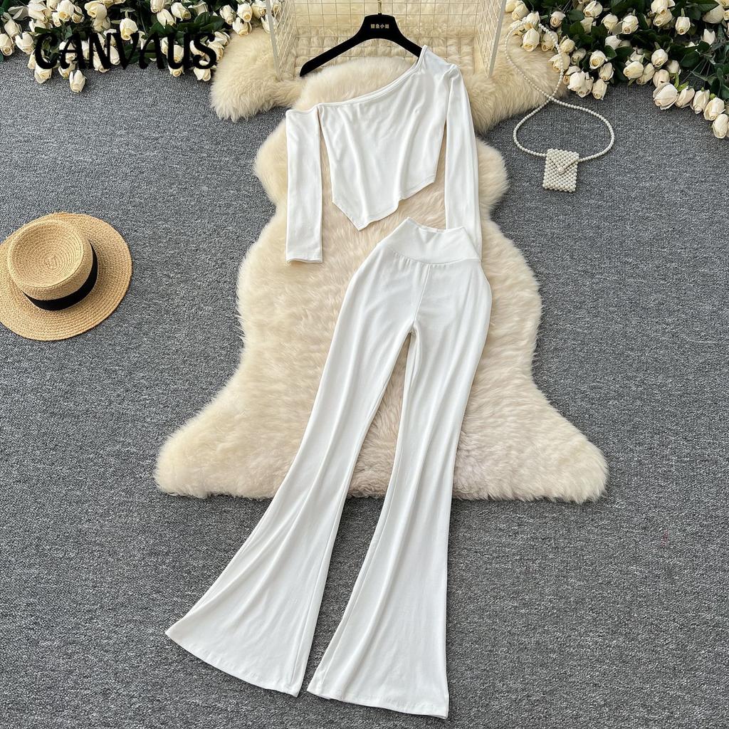 Sexy T-Shirt-Oberteil mit schrägem Halsausschnitt, trägerlos, langärmlig, unregelmäßig, hohe Taille, schmales Paket, Hüft-Mikro-Hosenanzug für Damen
