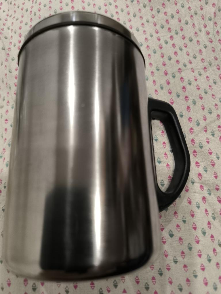 Großer Thermobecher für Kaffee oder Tee, Kakao... Aus Edelstahl, der Deckel sitzt fest, sieht sehr anständig aus. Allerdings denke ich, dass er die Wärme nicht lange hält und man einen vollen Becher auch nicht mitnehmen kann, da es kein Gewinde gibt und er auslaufen könnte. Eher dafür, dass der Kaffee nicht sofort abkühlt, wenn man durch irgendwelche Angelegenheiten abgelenkt wird.