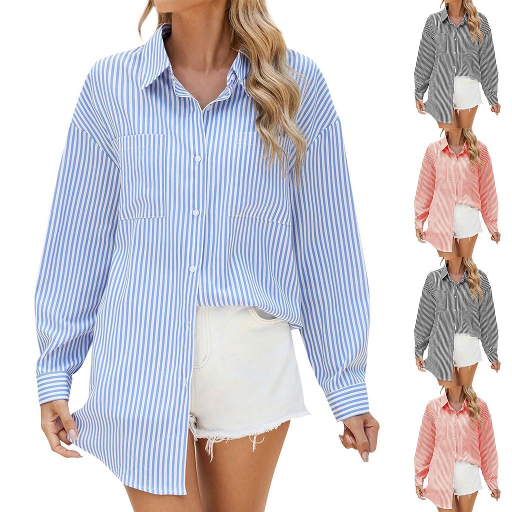Damen Revers Gestreiftes Lose Langarmhemd Taschenoberteil