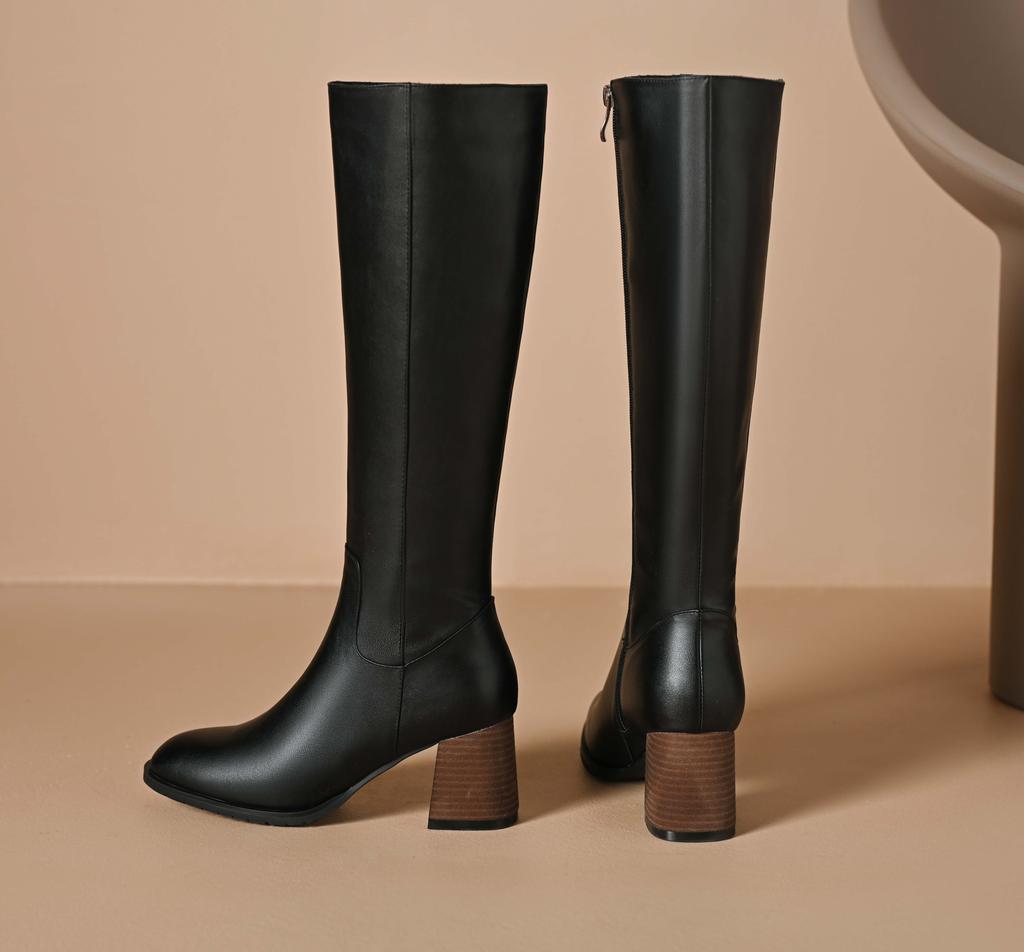 Krazing Pot Herbst-Winterschuhe aus Rindsleder, dicke High Heels, große Größe 34-Größe 46, Reißverschluss, Dekoration, prägnanter Stil, Damen, warm, Kniestiefel